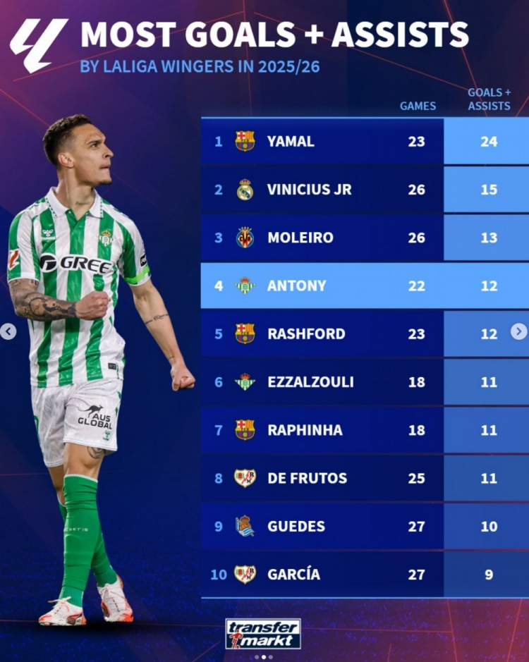 3月12日讯 德转盘点了本赛季西甲边锋位置球员在联赛中参与进球榜,其中亚马尔居首,具体榜单如下(进球+助攻):